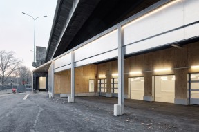 Proposition lauréate en janvier 2017 de l’appel à projet « Logistique urbaine durable » lancé par la Ville de Paris, cet entrepôt frigorifique bénéficie d’une convention temporaire du domaine public de 12 ans. Anticipant dès lors un cycle de vie réduit, le bâtiment est pensé comme un assemblage d’éléments pouvant être réutilisés à l’issue de cette convention. Se jouant de l’ombre du périphérique sous lequel il se glisse, l’édifice est pensé comme une lanterne qui s’infléchit au gré des géométries du site. Bien que temporaire, cette architecture ambitionne de donner ses lettres de noblesse au programme logistique.